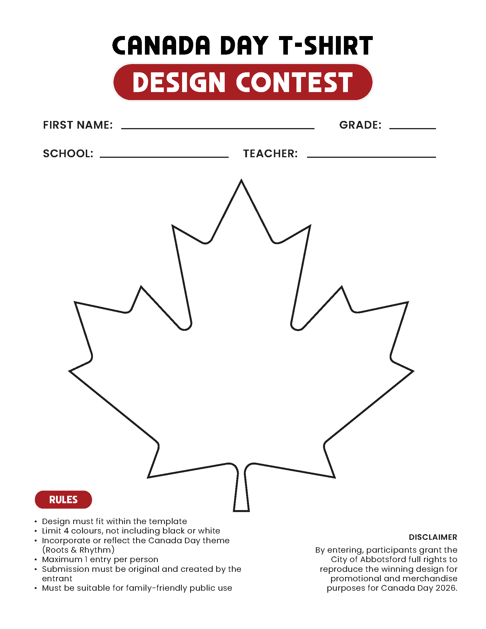 - By entering, participants grant the City of Abbotsford full rights to reproduce the winning design for promotional and merchandise purposes for Canada Day 2026.