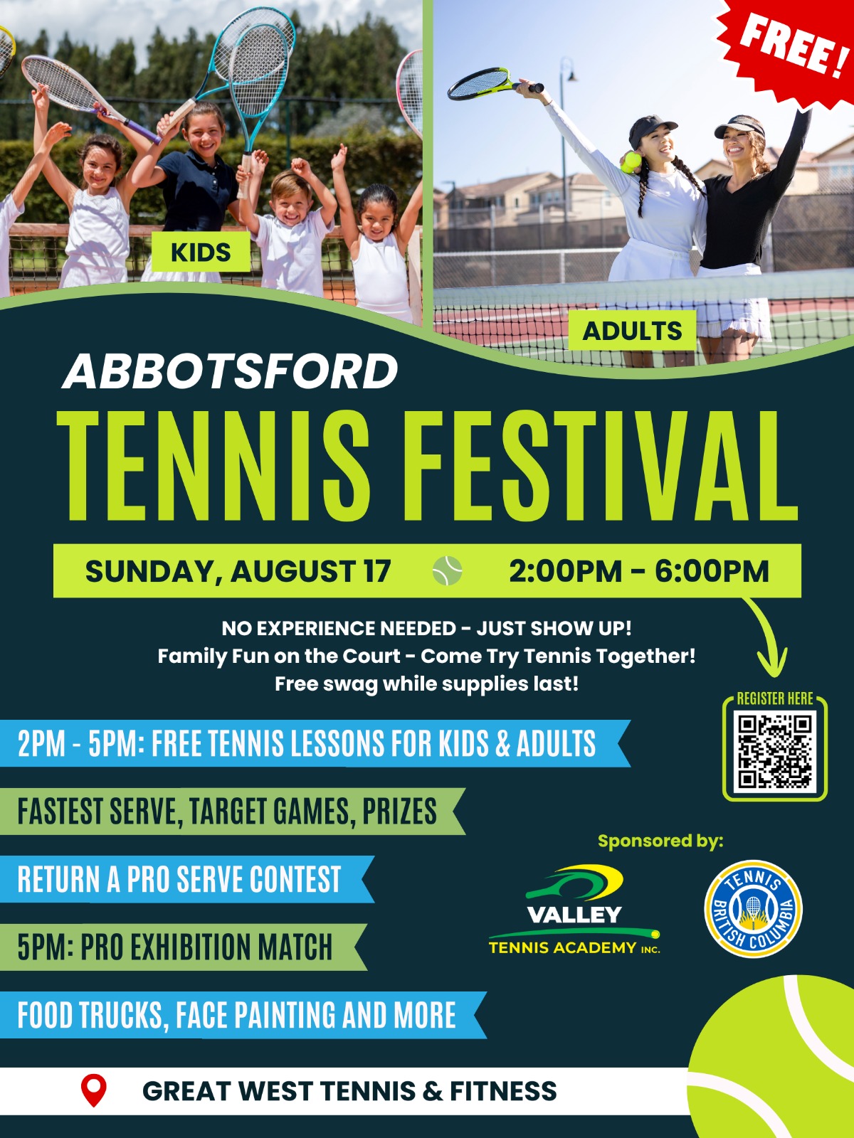 2-5pm free tennis lessons and games 5-6pm pro exhibition match food trucks and face painting