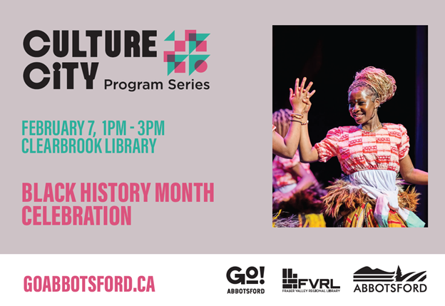 The Fraser Valley Heritage Elevation Society in collaboration with the City of Abbotsford and Abbotsford Libraries, FVRL is honored to host the 2026 Black History Month Celebration, a vibrant event dedicated to recognizing the resilience, achievements, and cultural contributions of Black peoples in Canada. This year’s celebration will feature a dynamic presentation on Canadian Black history, traditional African dance performances, drumming, and storytelling that highlight the richness and diversity of African heritage.