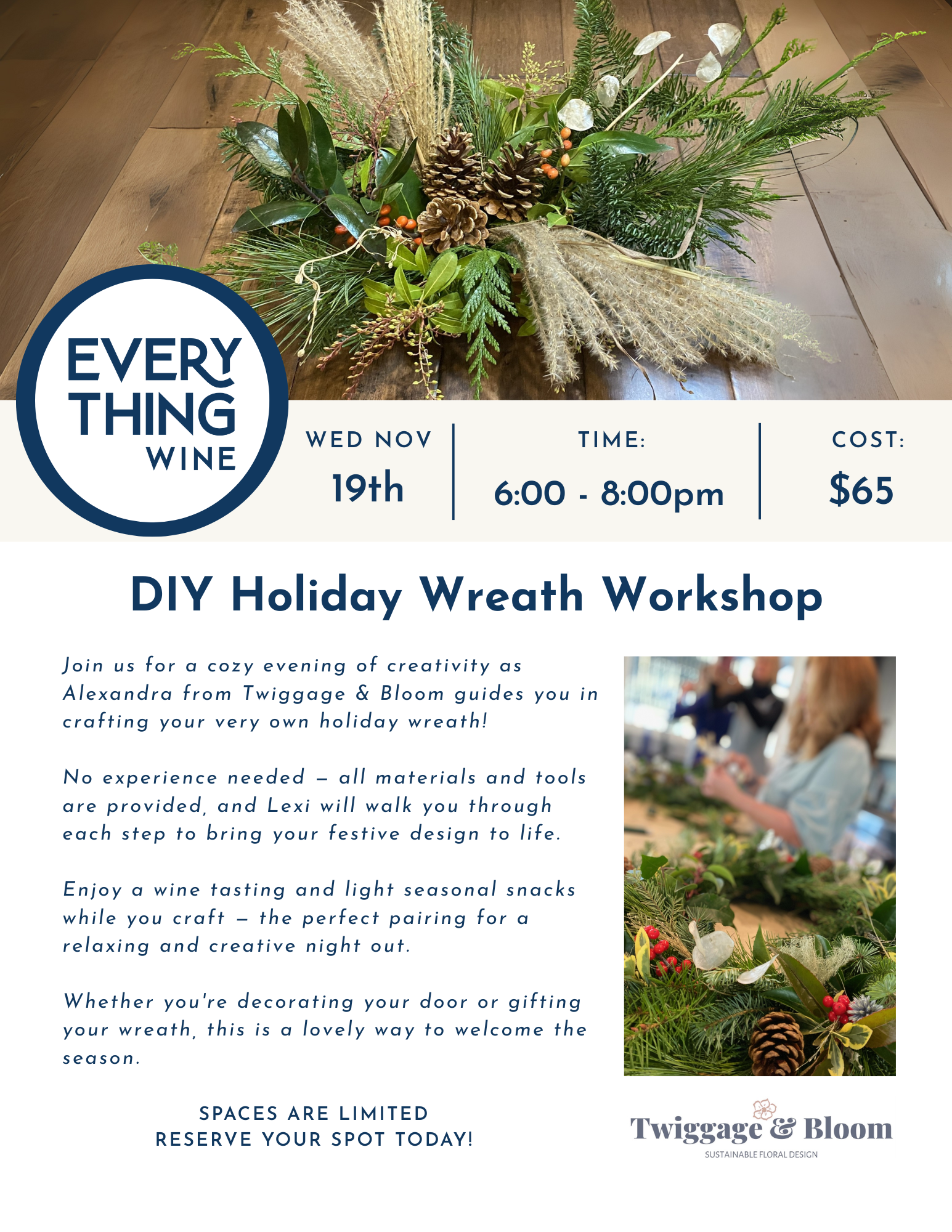Join us for a cozy evening of creativity as Alexandra from Twiggage & Bloom guides you in crafting your very own holiday wreath!