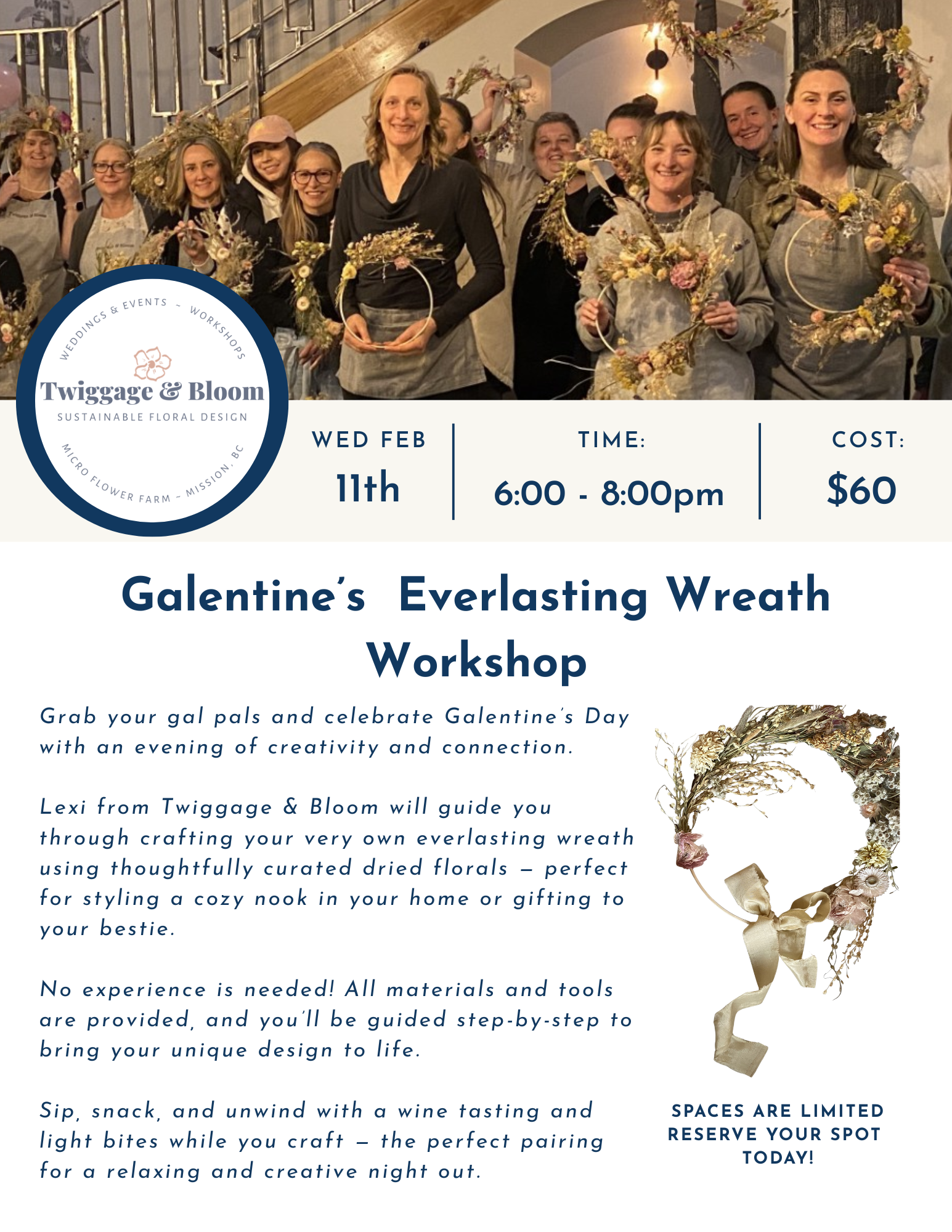 11feb6:00 pm8:00 pmGalentine's Everlasting Wreath Workshop6:00 pm - 8:00 pm(GMT-08:00) Everything Wine, McCallum Junction 125-1828 McCallum Rd. Abbotsford BC V2S 0H9