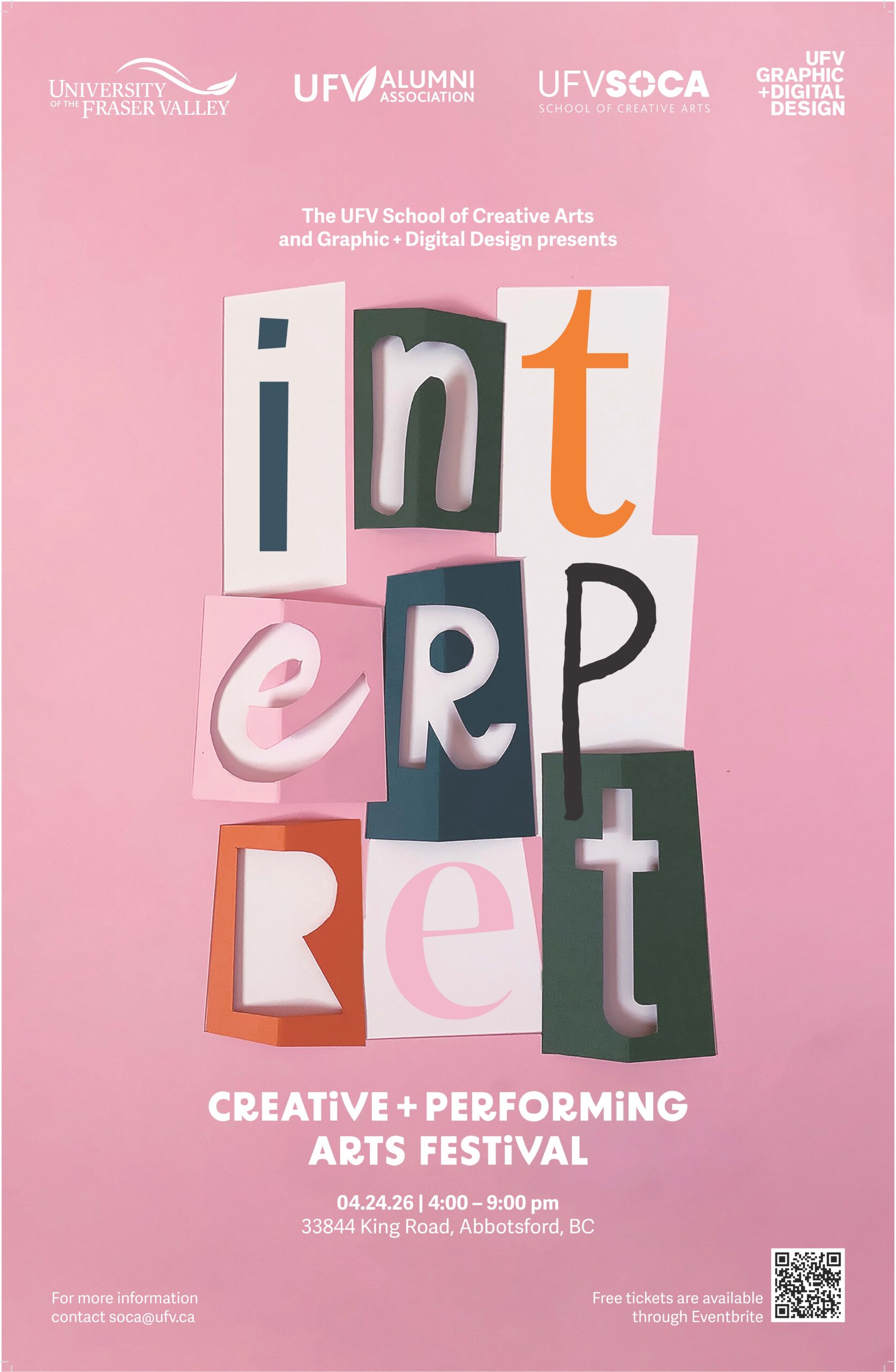 INTERPRET: Creative Performing Arts Festival Join us for the seventh annual Interpret Festival, hosted by the UFV School of Creative Arts (SoCA) and Graphic Digital Design, on April 24, 2026, from