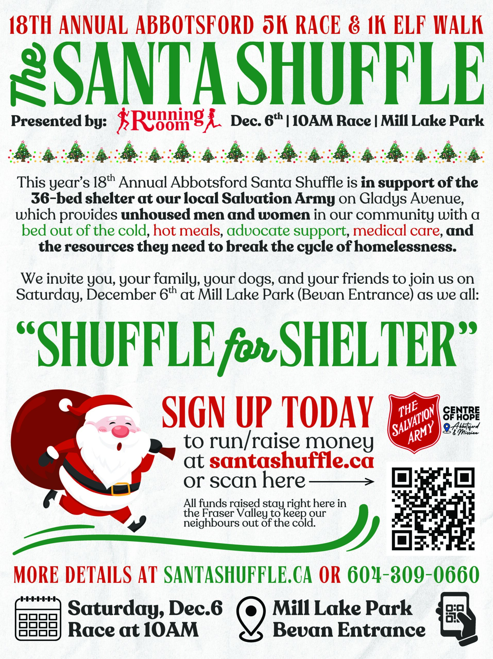 This year’s 18th Annual Abbotsford Santa Shuffle is in support of the 36-bed shelter located at the Centre of Hope, which provides unhoused men and women in our community with