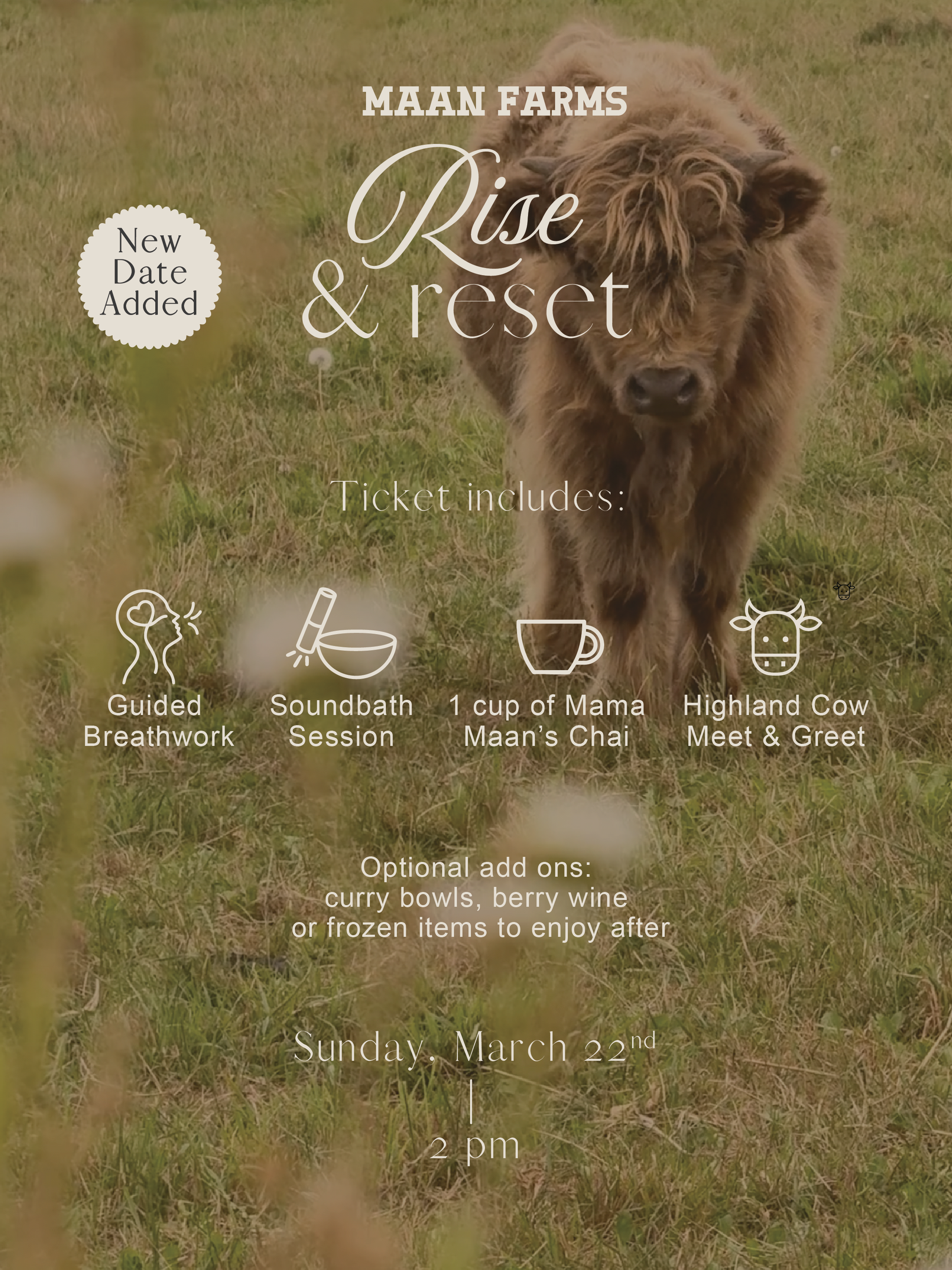 22mar2:00 pm4:00 pmRISE & RESETBreath • Sound • Highland Cows2:00 pm - 4:00 pm(GMT-07:00) MAAN FARMS (new sister property just down the road from Maan Farms), 240 McKenzie Road, Abbotsford, BC