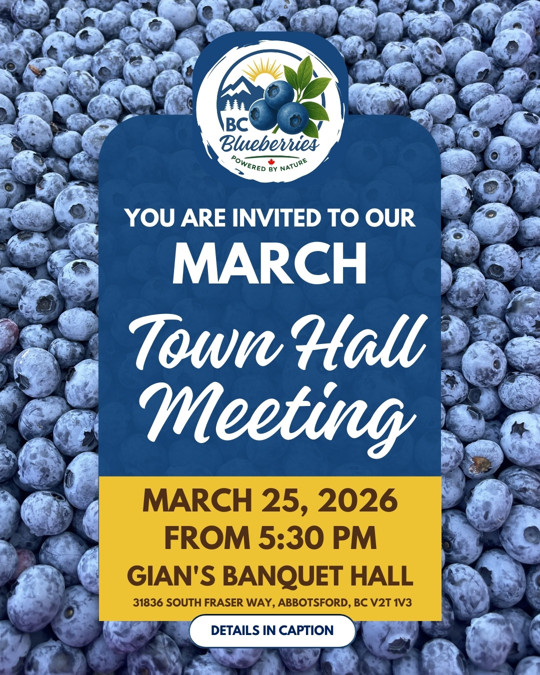 25mar5:30 pm7:30 pmTown Hall MeetingBC Blueberries March 2026 Town Hall Meeting5:30 pm - 7:30 pm(GMT-07:00) Gian’s Banquet Hall, 31836 South Fraser Way, Abbotsford, BC V2T 1V3, Canada