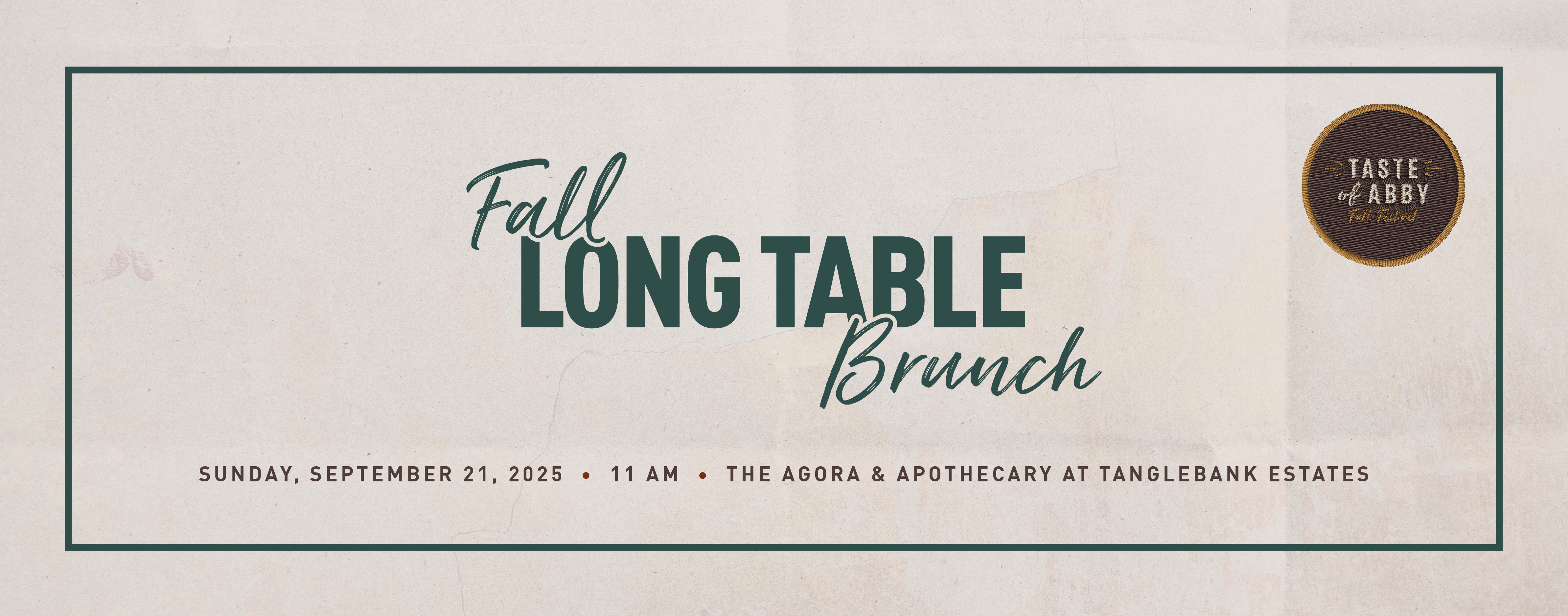 20sep11:00 amTaste of Abby Fall Long Table BrunchCelebrate the bounty of the Fraser Valley with a truly special experience at The Agora & Apothecary at Tanglebank Estate's Fall Long Table Brunch as a part of this year’s Taste of Abby Fall Festival, nestled within the picturesque grounds of Tanglebank Estate.11:00 am(GMT-07:00) Tanglebank Estate, 29985 Downes Rd. Abbotsford BC V4X 1Z8