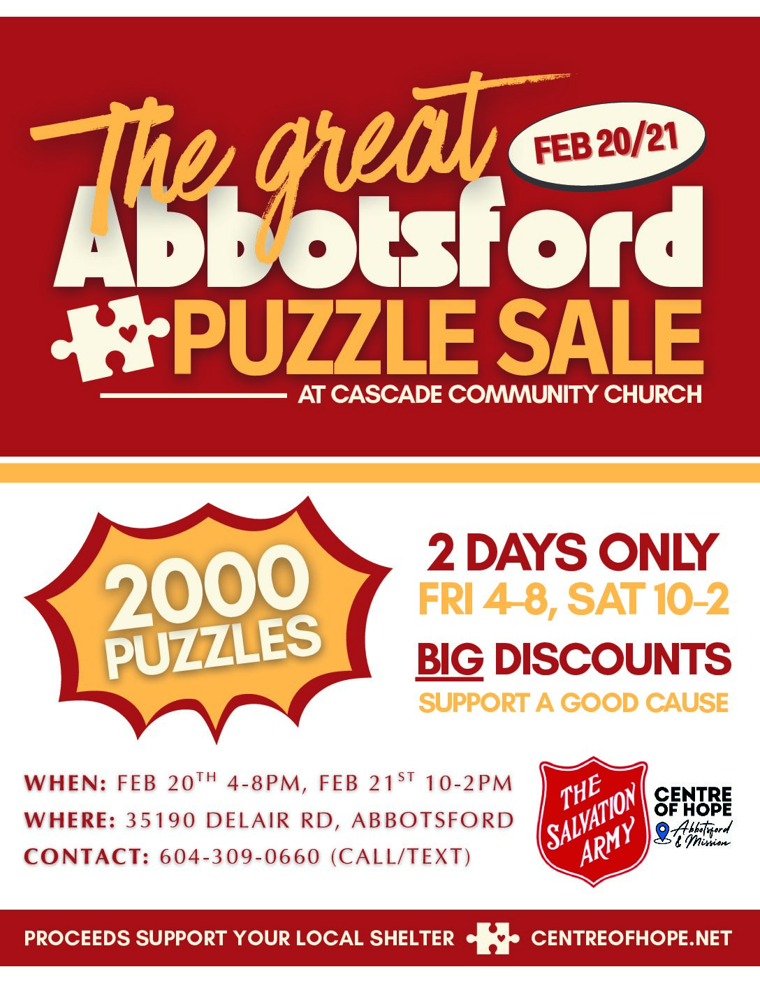 20feb(feb 20)4:00 pm21(feb 21)2:00 pmThe Great Abbotsford Puzzle Sale!Proceeds support your local shelter4:00 pm - 2:00 pm (21)(GMT-08:00) Cascade Community Church, 35190 Delair Road