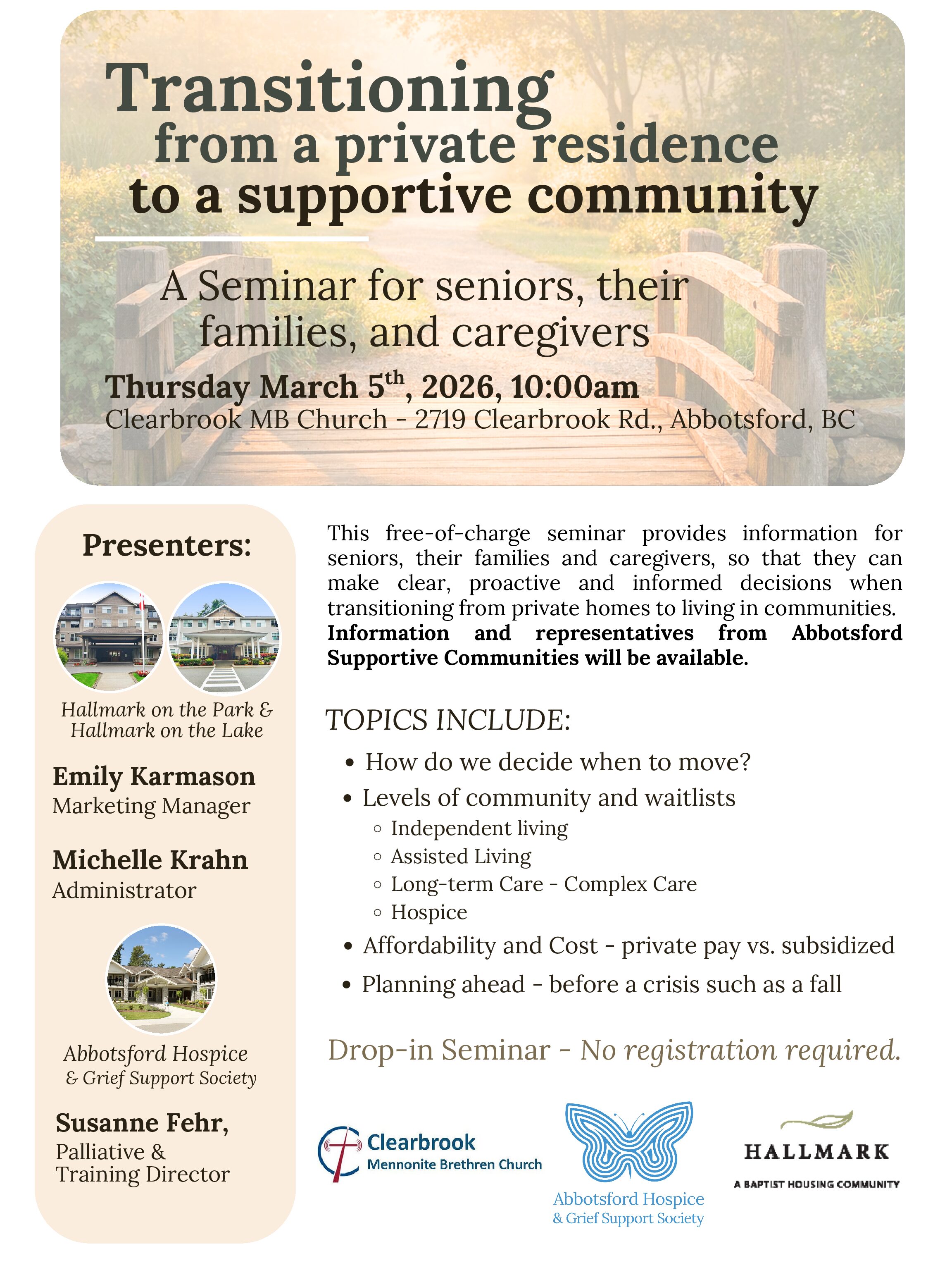 This free-of-charge seminar provides information for seniors, their families and caregivers, so that they can make clear, proactive and informed decision when transitioning from private homes to living in communities. Topics